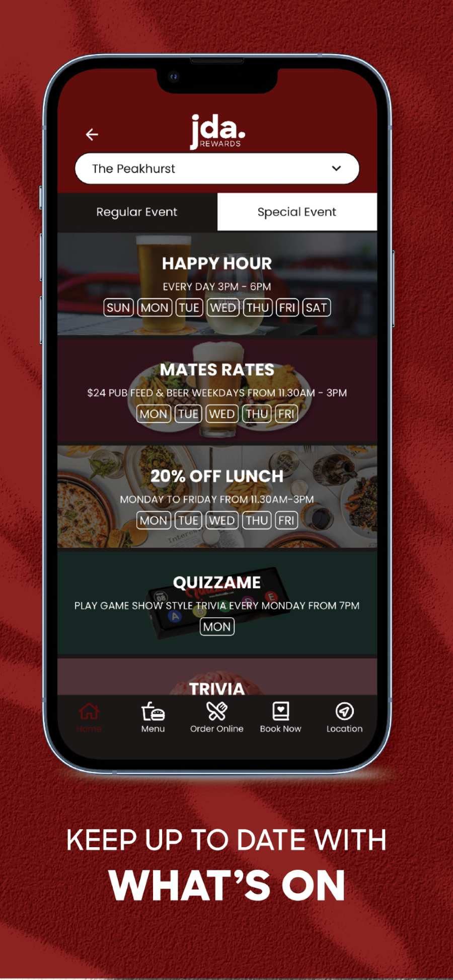 Sign up now to start receiving benefits on the JDA Rewards app and receive a FREE drink upon sign up. If you’re already a member, scan your app at the till to access all Huon Hill member benefits including: